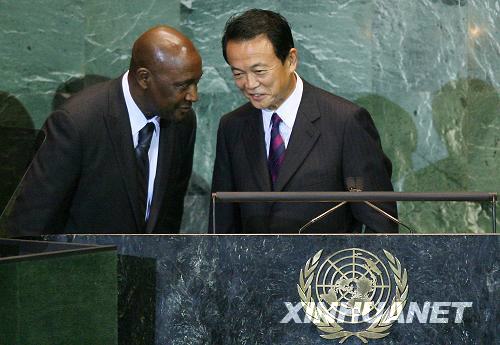 9月25日,在美國紐約聯(lián)合國總部,參加聯(lián)大一般性辯論的日本首相麻生太郎(右)用日語講了幾分鐘后被告知大會的日語翻譯還沒就位。直到日語翻譯就位后,麻生太郎才繼續(xù)演講。當日,第63屆聯(lián)大一般性辯論進入第三天。新華社記者 侯俊 攝