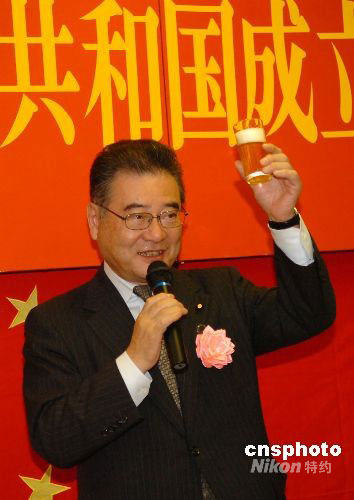 日中友好協(xié)會(huì)新任會(huì)長、自民黨原干事長加藤紘一舉杯祝愿中日兩國世代友好。
