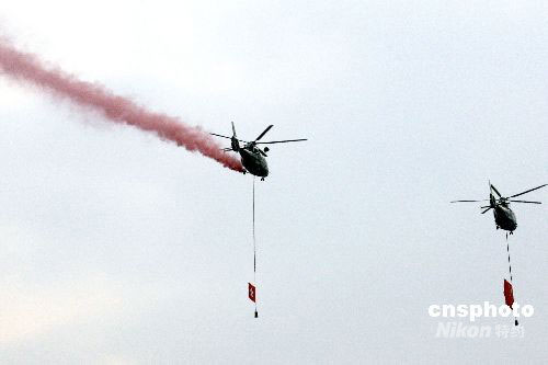升旗儀式中,直升機懸掛國旗、區(qū)旗,噴射彩色煙火掠過金紫荊廣場上空。