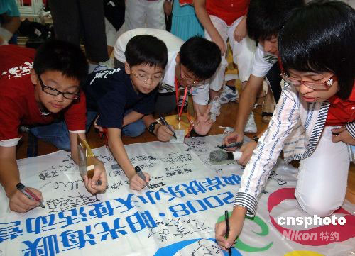圖為臺(tái)北光復(fù)小學(xué)學(xué)生與福建小營(yíng)員們共同在“2008·陽(yáng)光海峽”兩岸快樂(lè)小天使活動(dòng)營(yíng)旗上簽名。