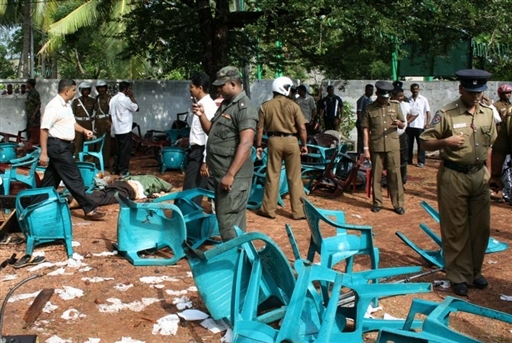 10月6日,在斯里蘭卡北部阿努拉德普勒鎮(zhèn),安全人員查看爆炸現(xiàn)場。當(dāng)天上午,一名自殺式襲擊者在阿努拉德普勒鎮(zhèn)老汽車站附近引爆了身上的炸彈。包括斯前陸軍參謀長佩雷拉及其夫人在內(nèi)的至少27人在爆炸中死亡。