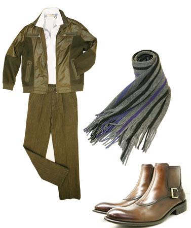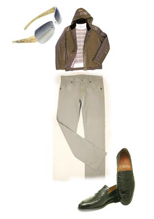 “皮”氣致搭:深栗色亞光帶帽夾克衫+法蘭絨帶褶長(zhǎng)褲+斜紋真絲方巾+鱷魚皮鞋