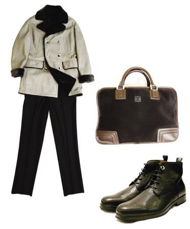 “皮”氣致搭:霧灰色羊毛領(lǐng)一體皮衣+絲絨面料男長(zhǎng)衫+男西褲+小牛皮男鞋