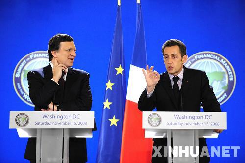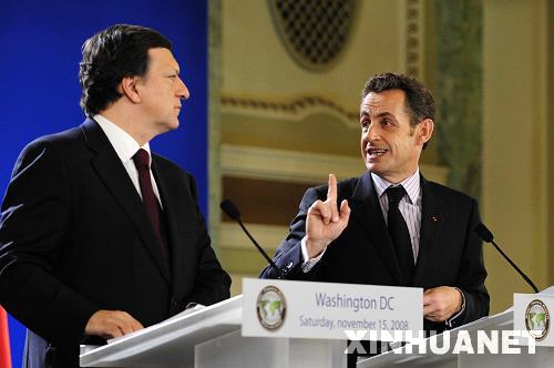 11月15日,在美國首都華盛頓出席二十國集團領導人金融市場和世界經(jīng)濟峰會的法國總統(tǒng)薩科齊(右)和歐盟委員會主席巴羅佐聯(lián)合舉行新聞發(fā)布會。 新華社記者張巖攝
