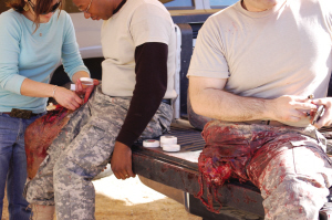 訓(xùn)練現(xiàn)場一個(gè)最震撼人心的場面:軍車被炸后,“傷兵”股動(dòng)脈會(huì)向外“噴血”。