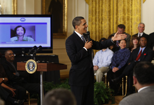 奧巴馬當(dāng)日在白宮首次以網(wǎng)絡(luò)視頻方式回答網(wǎng)友及現(xiàn)場(chǎng)民眾代表的提問(wèn)。就業(yè)、醫(yī)療、教育、房貸等民生問(wèn)題是當(dāng)日奧巴馬網(wǎng)絡(luò)答疑的重點(diǎn)。