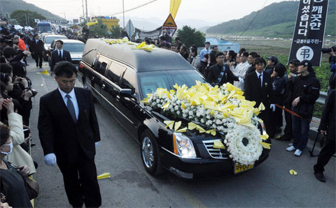 有關人員捧著牌位和無窮花大勛章出來,隨后盧武鉉前總統(tǒng)的棺柩經過峰下村,運至黑色凱迪拉克,現(xiàn)場傳出哀戚嗚咽的哭聲。