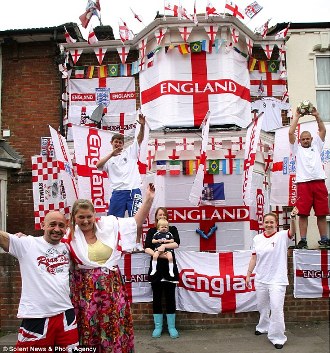 來自科爾福德的瑞安•奧德爾就將自家的房屋刷成了一幅巨大的英格蘭旗幟,上面還貼上了球隊的隊標(biāo),借以表達(dá)他對球隊的支持。球迷托尼•巴德斯則花了一周的時間將自家的房屋用各式各樣的旗幟遮了個嚴(yán)嚴(yán)實實。就連英國農(nóng)場的馬匹也都穿上了特制的英格蘭足球隊隊服,在草場狂奔。