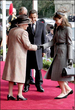薩科齊夫婦隨后來到溫莎堡,英國女王在那里迎接他們到訪?ɡ·布呂尼向女王行屈膝禮,之前布呂尼已經(jīng)為這次見面準備了很長時間。薩科齊則在女王丈夫菲利浦親王的陪同下檢閱了英國皇家軍隊。