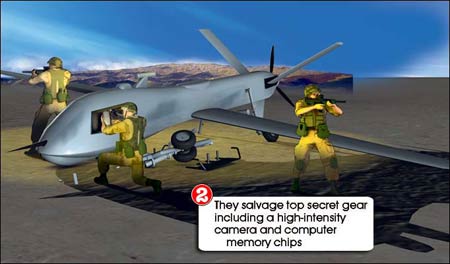 之后,隊員們沿繩索攀爬回直升機(jī),并用激光制導(dǎo)炸彈將偵察機(jī)引爆。