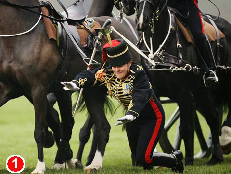 21日當(dāng)天,英國皇家騎兵團(tuán)的成員攜禮炮向海德公園進(jìn)發(fā),一路上不少民眾擠在道路兩旁觀看。忽然一名年輕的女炮手跌身下馬,眾目睽睽之下,她慌忙環(huán)視四周并立即翻身上馬,以保證隊(duì)列安全行進(jìn)。英國《每日郵報(bào)》的記者眼疾手快,將女炮手摔下馬的情景搶拍了下來。(梁陳聰)