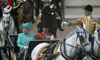 據英國廣播公司報道,按照傳統(tǒng),女王夫婦搭乘開敞篷馬車抵達白金漢宮邊上的馬隊校閱場。王儲查爾斯王子和安妮公主則率馬隊跟隨。