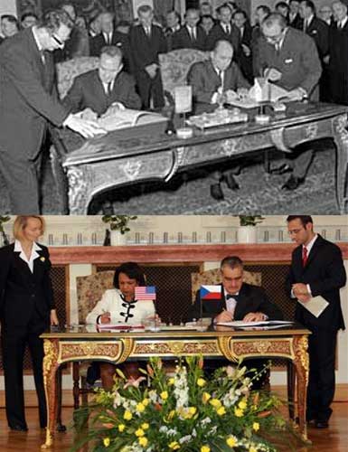 當(dāng)賴斯和施瓦岑貝格笑容可掬地站在那張金碧輝煌的雕花簽字桌旁沖著記者們的閃光燈舉起手里一紅一黑的協(xié)定時(shí),他們還不知道在同一張簽名桌上40年前誕生過一個(gè)令捷克蒙受奇恥大辱的城下之盟。