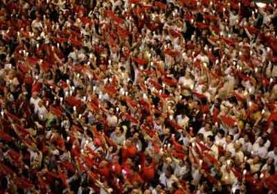 中新網(wǎng)7月15日電 綜合報(bào)道,7月15日凌晨,為期9天的盛大的奔牛節(jié)在西班牙北部城市潘普洛納落下帷幕。成千上萬的狂歡者聚集到市政廳前,手舉蠟燭和紅絲巾參加閉幕活動(dòng)。