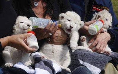 該動(dòng)物園的兩只母白獅6月30日同時(shí)產(chǎn)下總共7只小白獅。7只小白獅4只為雄性,3只為雌性。但是其中一只母獅拒絕喂養(yǎng)自己的4只小獅子,因而動(dòng)物園的管理員飼養(yǎng)了這些可愛的小家伙。