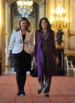 資料圖片:英國(guó)首相夫人莎拉(左)與法國(guó)第一夫人布呂尼。