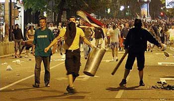29日晚的抗議集會(huì)吸引約2萬人,這一人數(shù)比組織者所希望的少。100名據(jù)信是貝爾格萊德紅星足球俱樂部支持者隨后離開抗議集會(huì)人群,他們向防暴警察扔磚頭、炮竹,警方則用催淚彈和橡皮子彈進(jìn)行反擊。貝爾格萊德市中心很快變成一個(gè)垃圾場,街上到處都是玻璃和其它垃圾,40余人在沖突中受傷,其中包括一名西班牙攝影師。