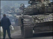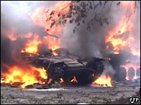 俄羅斯電視播放了格魯吉亞坦克在燃燒的圖像。