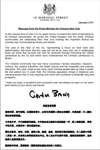 中新網(wǎng)1月24日電 據(jù)“中央社”報道,23日,英國首相布朗向華人拜年,誠摰祝福大家新的一年心想事成,順利成功,并希望新的一年有更多華人參政。