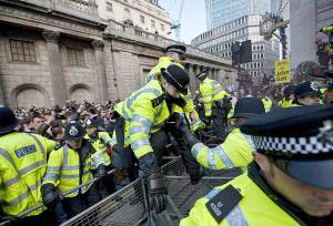 目前,有1200名示威者聚集在英格蘭銀行門口,進(jìn)行抗議活動(dòng)。為了防止更多的示威者接近央行,警察不得不動(dòng)用大量防暴車輛將附近的道路團(tuán)團(tuán)圍住。而在倫敦西德尼德街與巴塞洛繆巷的交界處,眾多蒙面男子試圖闖過(guò)警察的封鎖線來(lái)進(jìn)行抗議活動(dòng),遭到了警察的圍堵。這些蒙面男子則向警察投擲空易拉罐、水果和面粉。目前至少有一名警察的額頭被打破。面對(duì)警方派出的增援部隊(duì),蒙面男子們大喊著“混蛋警察”、“這是我們的街道”等口號(hào)。就在警方維持秩序的同時(shí),抗議隊(duì)伍的前排有一位示威者的額頭也被打破。而一位身著黑衣、戴著面具的男子則手持著一根木棒,試圖上前毆打警察。一位警官因被擊中被帶到僻靜處進(jìn)行治療。