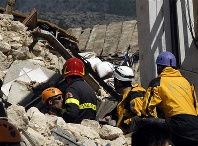 拉奎拉省的平民保護(hù)部門官員估計(jì),當(dāng)?shù)匾延腥种慕ㄖ锏顾。?jù)估計(jì),數(shù)名大學(xué)生仍然被埋在一幢大學(xué)宿舍的瓦礫下,該處仍有一批救援人員和消防員在泛光燈的照明下進(jìn)行搜索。