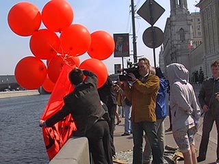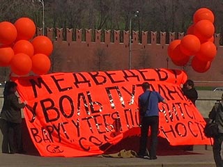 據(jù)俄羅斯新聞網(wǎng)報道,俄羅斯反對黨“團(tuán)結(jié)運(yùn)動”組織成員4月28日在克里姆林宮前舉行了聲勢浩大的反政府游行活動。期間,3名“團(tuán)結(jié)運(yùn)動”的積極分子在克里姆林宮附近的河岸邊懸掛紅色的巨型橫幅,上面印有:“梅德維杰夫,辭去普京總理職務(wù)!弊謽樱瑱M幅兩邊系有紅色的氣球,橫幅下部印有“團(tuán)結(jié)運(yùn)動”組織的徽標(biāo)。