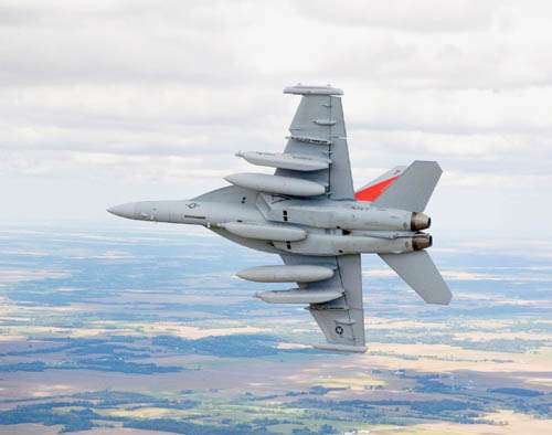 由波音公司生產(chǎn)的EA─18G“咆哮者”電子作戰(zhàn)高性能戰(zhàn)機(jī),是屬于FA─18“大黃蜂”型戰(zhàn)機(jī)的改良型先進(jìn)戰(zhàn)機(jī)。EA─18G“咆哮者”可以攜帶反雷達(dá)空地導(dǎo)彈的電子作戰(zhàn)軍機(jī),能夠在極短的距離內(nèi)起飛降落,同時有干擾敵方雷達(dá)與電子裝備的能力。美軍在伊拉克就是使用舊版“咆哮者”來干擾路邊炸彈的引爆訊號。