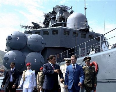 梅德韋杰夫和查韋斯抵達(dá)港口,迎接“恰巴年科海軍上將”號全體官兵。兩位元首參觀了軍艦,之后與俄羅斯海員進(jìn)行了交談。