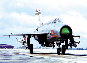 新聞背景 據(jù)美聯(lián)社報(bào)道,2008年底,作為冷戰(zhàn)的一個(gè)象征,在與蘇聯(lián)的主要對(duì)手——北約的對(duì)抗前線服役了50年后,米格-21戰(zhàn)機(jī)行將退役。英國專業(yè)刊物《空軍月刊》的編輯阿倫·沃恩斯評(píng)論:“在第二次世界大戰(zhàn)之后的歐洲,沒有任何一種飛機(jī)能像米格-21那樣,對(duì)軍事航空領(lǐng)域產(chǎn)生那么深遠(yuǎn)的影響”。