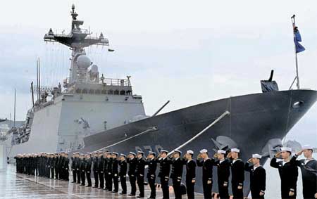 中新網(wǎng)3月4日電 據(jù)韓國《中央日報》報道,3日,將被派遣到索馬里海域的韓國海軍“清海部隊”成立儀式在海軍作戰(zhàn)司令部釜山基地舉行。清海部隊擁有一艘4500噸級驅(qū)逐艦“文武大王艦”、一架反潛直升機和30名履行訊問搜索任務(wù)的特戰(zhàn)人員等,加上文武大王艦上原有的船員,總規(guī)模達到了300多人。