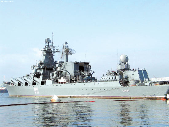 俄羅斯海軍也派出素有“航母殺手”之稱的“瓦良格”號(hào)導(dǎo)彈巡洋艦參加此次閱兵式。該艦已于13日從符拉迪沃斯托克的金角灣出發(fā)前往中國!巴吡几瘛碧(hào)是俄羅斯太平洋艦隊(duì)的旗艦,主要武器為16枚SS-N-12超音速反艦導(dǎo)彈,可攜帶1000公斤裝藥的常規(guī)彈頭或射程達(dá)300海里的戰(zhàn)術(shù)核彈頭。