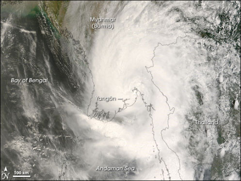 美國“今日宇宙”(universetoday)網(wǎng)站公布的衛(wèi)星照片顯示,強熱帶風暴“納爾吉斯”2日開始在緬甸伊洛瓦底省;鶏u附近登陸,風暴登陸時的最大風力超過190公里。風暴登陸后轉(zhuǎn)向緬甸三角洲地區(qū),一路掃蕩伊洛瓦底省、勃固省和仰光省,3日凌晨突然抵達仰光市中心。屬于第三級熱帶氣旋的“納爾吉斯”一路沿仰光西南約220公里的伊江江口登陸北上,沿途摧毀無數(shù)的建筑物。
