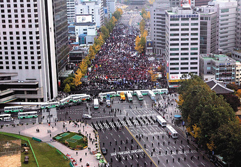 為了抗議韓國政府與美方簽訂自由貿(mào)易協(xié)議,由農(nóng)人和工人組成的示威團(tuán)體,再度走上街頭,原本的和平示威、演變成激烈的警民沖突。