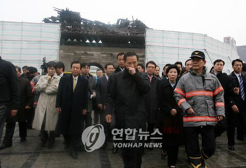 據(jù)韓聯(lián)社報(bào)道,李明博于當(dāng)天上午改變?cè)ㄈ粘,與政權(quán)接管委員會(huì)委員長李慶淑和副委員長金炯旿等人訪問了崇禮門,在視察化成灰燼的“國寶一號(hào)”火災(zāi)現(xiàn)場(chǎng)期間李明博始終表情沉重,一言不發(fā)。