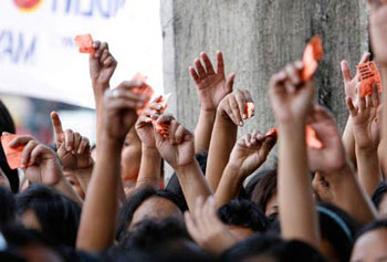 4月18日,菲律賓馬尼拉,大批貧民手持對換劵擁擠在一起,等候領取裝有大米和罐頭的禮物包。這是菲律賓前總統埃斯特拉達為慶祝自己71歲生日,而特意向窮人施舍的。