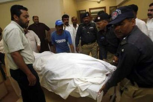 5月23日晚,巴基斯坦穆斯林聯(lián)盟(謝里夫派)副主席塔里克·漢在卡拉奇遭不明身份人員槍擊身亡,圖為警察在轉(zhuǎn)運(yùn)尸體(國(guó)際在線配圖)