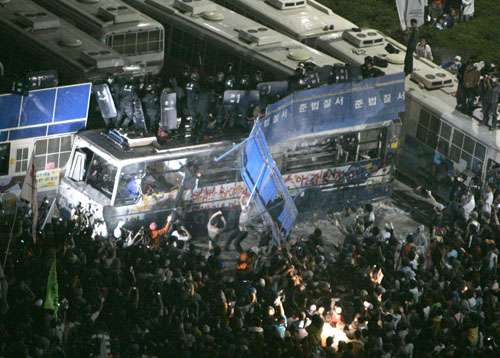 另外,韓國(guó)首都首爾昨天清晨的4萬人燭光集會(huì)示威演變成暴力沖突,延至日出后才平息。示威者用棍棒攻擊警員,又用梯子擊碎用作路障的防暴巴士的窗戶,并試圖推翻巴士,警方則以防暴盾牌還擊,據(jù)報(bào)雙方更曾在巴士車頂上開戰(zhàn)。組織示威者表示最少有20名示威者受傷,首爾大學(xué)醫(yī)院則指治療過6個(gè)人,已全數(shù)出院。據(jù)悉亦有警員受傷,及11名示威者被扣留問話。