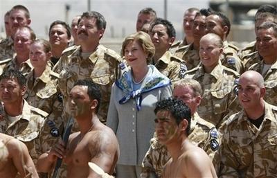 據(jù)臺(tái)灣東森新聞報(bào)道,為了歡迎第三度造訪阿富汗的美國(guó)第一夫人勞拉-布什來到新西蘭負(fù)責(zé)的重建區(qū),新西蘭士兵表演了一段毛利人的戰(zhàn)舞,一群大兵加上士官一起表演,氣勢(shì)更顯宏偉。