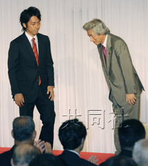 日本前首相小泉純一郎在演講會上向接班人次子進次郎行禮。