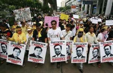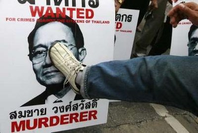反政府示威者抗議總理頌猜采用強制手段鎮(zhèn)壓民眾。當日,示威者封鎖了一條商業(yè)街道,并四處散發(fā)記錄7日警民對峙的碟片及照片,還有人高舉稱警察總長和頌猜為“殺手”的標語。