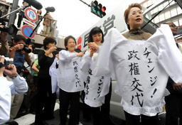同時,日本在野黨民主黨派出了三位高官夫人——民主黨最高顧問、日本前首相羽田孜的夫人綏子、代表代行菅直人的夫人伸子、干事長鳩山由紀(jì)夫的夫人幸!叭蛉塑妶F(tuán)”身穿廚師樣式的服裝,上書“改變!政權(quán)替換”,來到東京巢鴨的購物街,和正在購物的家庭婦女一一握手。其間,一名60歲的老婆婆一臉郁悶,說“我已經(jīng)在很努力削減家庭開支了,可是國家還是在浪費。”三位夫人馬上建議說,“下次讓民主黨執(zhí)政看看吧!”