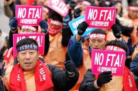 據悉,當天韓國農民綁上紅色頭巾,身穿盛載裝大米的麻包袋、高叫口號,警方估計有大約1萬人。韓國農民認為市場開放會損害他們生計,又要求政府提供更多補貼,盡快遏抑肥料及畜牧飼料價格上升。首爾與華盛頓政府去年達成協定,等待國會審核。