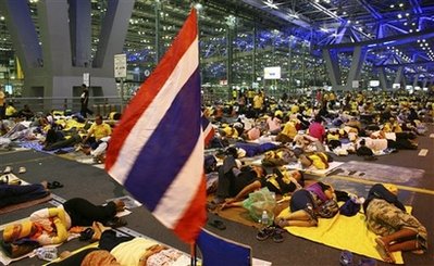據(jù)悉,約2000名示威者闖入新國際機(jī)場客運(yùn)大樓的離境大堂,泰國機(jī)場公司宣布在當(dāng)?shù)貢r(shí)間25日晚上9時(shí)起暫時(shí)關(guān)閉機(jī)場,準(zhǔn)備在機(jī)場降落的航機(jī)要轉(zhuǎn)飛清邁、布吉和其它地區(qū)的機(jī)場,數(shù)以千計(jì)旅客滯留。