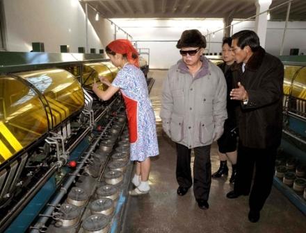 金正日第一站來到了平壤紡紗工廠,他走訪了卷絲、紡紗等多個(gè)車間,并詳細(xì)詢問了絲綢制造的技術(shù)更新等問題。