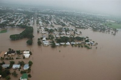 澳大利亞北部則是一夜之間洪水泛濫,350厘米的雨量導(dǎo)致大水沖進(jìn)城鎮(zhèn),造成河水高漲。昆士蘭幾乎全成了災(zāi)區(qū),最近兩次颶風(fēng)所帶來的暴雨淹沒了100萬平方公里的土地與3000民宅。蔗田與畜牧業(yè)也遭受洪水肆虐,數(shù)以萬計(jì)的牲畜死亡。