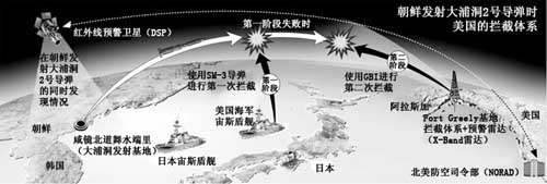 此外,韓國(guó)軍方預(yù)測(cè),朝鮮如果發(fā)射能夠威脅美國(guó)本土的大浦洞2號(hào)改良型導(dǎo)彈,美國(guó)將分兩個(gè)階段予以攔截。大浦洞2號(hào)導(dǎo)彈發(fā)射后,朝鮮半島上空的美國(guó)紅外線預(yù)警衛(wèi)星(DSP)將首先發(fā)現(xiàn)情況。導(dǎo)彈尾部的火焰在太空中也能得到確認(rèn)。預(yù)警衛(wèi)星將向美國(guó)的所有導(dǎo)彈防御體系發(fā)送警報(bào)。導(dǎo)彈升空后,第一階段的攔截體系開始運(yùn)作。位于東海的美國(guó)海軍宙斯盾艦將通過(guò)相控陣?yán)走_(dá)實(shí)時(shí)預(yù)測(cè)導(dǎo)彈的軌跡。如果大浦洞2號(hào)導(dǎo)彈接近日本列島,宙斯盾艦將發(fā)射SM-3導(dǎo)彈進(jìn)行攔截。美國(guó)第7艦隊(duì)擁有夏洛號(hào)巡洋艦(CG-67)和斯特塞姆號(hào)驅(qū)逐艦(DDG-63)等九艘宙斯盾艦,一次可以發(fā)射多枚SM-3導(dǎo)彈。盡管日本海上自衛(wèi)隊(duì)的宙斯盾艦上也裝備有SM-3導(dǎo)彈,但是由于日本的和平憲法禁止自衛(wèi)隊(duì)在日本境外使用武器,所以在攔截導(dǎo)彈問(wèn)題上受到了限制。