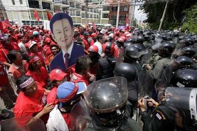10日上午,泰國(guó)反獨(dú)裁民主聯(lián)盟的示威者穿過(guò)了泰國(guó)警方在東盟與對(duì)話國(guó)系列會(huì)議會(huì)場(chǎng)外圍設(shè)制的多道警戒線,已在會(huì)場(chǎng)門口集結(jié)。