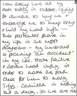 戴安娜在信中寫到,“我現(xiàn)在坐在這里,希望有人能來(lái)抱抱我,鼓勵(lì)我保持堅(jiān)強(qiáng),昂起我的頭顱。我生命現(xiàn)在處在一個(gè)非常危險(xiǎn)的時(shí)期,我的丈夫想要制造一起‘車禍’謀殺我,比如剎車失靈然而引起頭部重傷等等。只有這樣他才能為自己與堤姬(查爾斯與戴妃離婚后專門負(fù)責(zé)照顧哈里和威廉的保姆)成婚掃清障礙?桌贿^(guò)是個(gè)誘餌,而我們兩人都是被他利用了。”