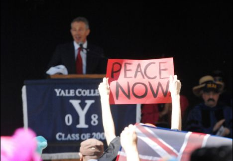 布萊爾由于支持布什的反恐戰(zhàn)爭而在美國很受歡迎,但他在抵達耶魯大學(xué)發(fā)表講演時遭遇了意料之外的抗議活動。一些學(xué)生將寫有反戰(zhàn)口號的標(biāo)語偷偷地帶進講演地點。當(dāng)布萊爾發(fā)表講演時,一些學(xué)生將這些標(biāo)語舉起,當(dāng)他講演完畢時,人們從掌聲中也能聽到噓聲。