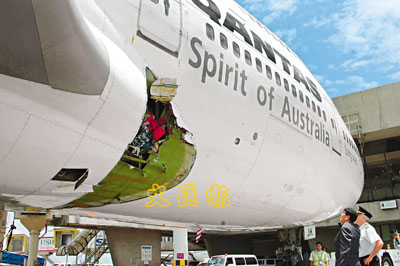 據(jù)香港《文匯報》報道,這架澳航QF30客機,25日晨9時由香港起飛,原定當(dāng)?shù)貢r間晚上約10時飛抵墨爾本,但在起飛約1小時后,機身近右邊機翼部分突然傳出巨響,機師決定緊急降落馬尼拉,11時左右安全著陸后,機上346名乘客和19名機組人員無人受傷。